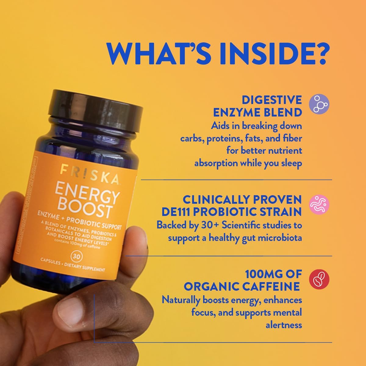 Not your average energy boost - Proprietary blend of digestive enzymes with potent probiotics and energy-boosting, naturally sourced caffeine to give you healthy digestion support while boosting energy levels. Daily supplement for men and women.